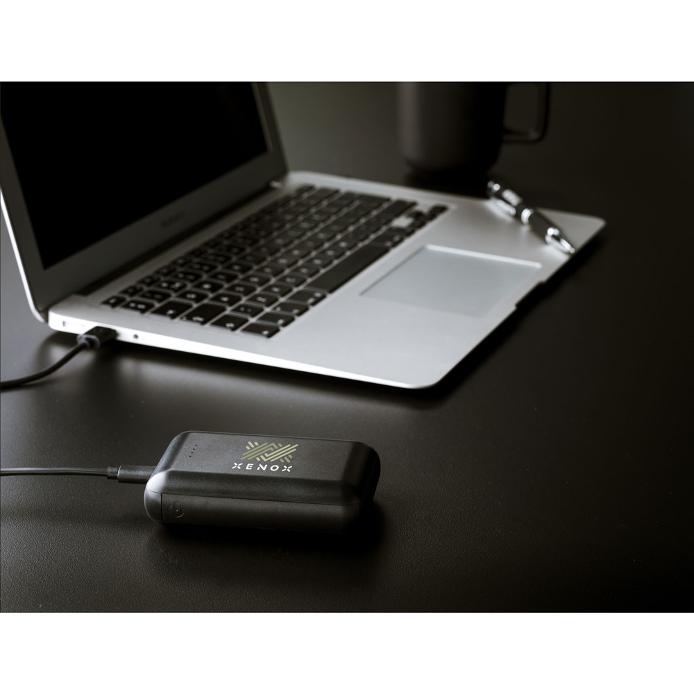 Kleine, lichte en zeer krachtige wireless charging (5W) powerbank van gerecycled ABS met ingebouwde lithium-polymeerbatterij (10.000 mAh). Deze krachtpatser past gemakkelijk in je broekzak waardoor je hem comfortabel overal mee naar toe kunt nemen. Ondanks het geringe formaat draag je genoeg power met je mee om je telefoon veelvuldig op te laden via de 2 USB poorten of de geïntegreerde 5W wireless laadfunctionaliteit (ondersteunt draadloos opladen van mobiele apparaten die QI draadloos laden ondersteunen). Input 5V/2A. 2x Output: 5V/2A. Draadloze output: 5W. Met indicatielampjes en aan/uit knop. Inclusief oplaadkabel USB-C naar USB-C en gebruiksaanwijzing. Per stuk verpakt.